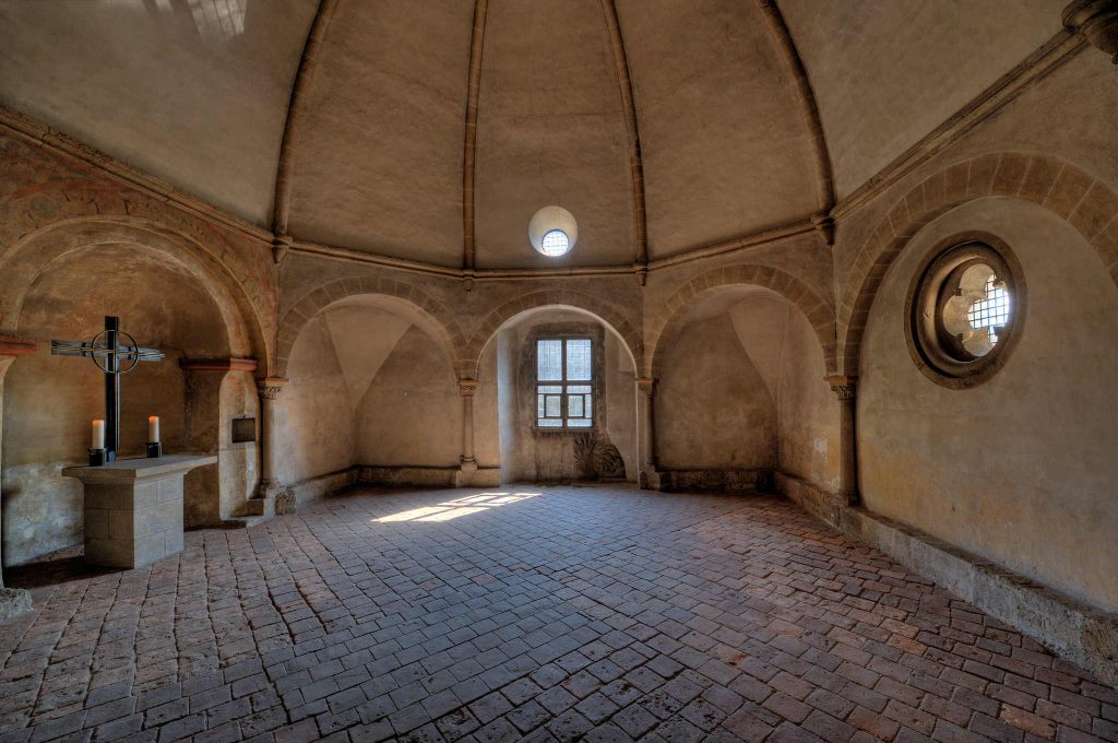 Dans l’architecture romane, la voûte se manifeste principalement sous la forme de la voûte en plein cintre. Robuste et massive, elle contribue à l’aspect solide et parfois austère des églises romanes. Elle est souvent associée à des murs épais et à des ouvertures relativement petites pour supporter son poids et ses poussées. Les voûtes en berceau, qui sont essentiellement une voûte en plein cintre prolongée, sont également caractéristiques de cette période, utilisées pour couvrir de longs nef.